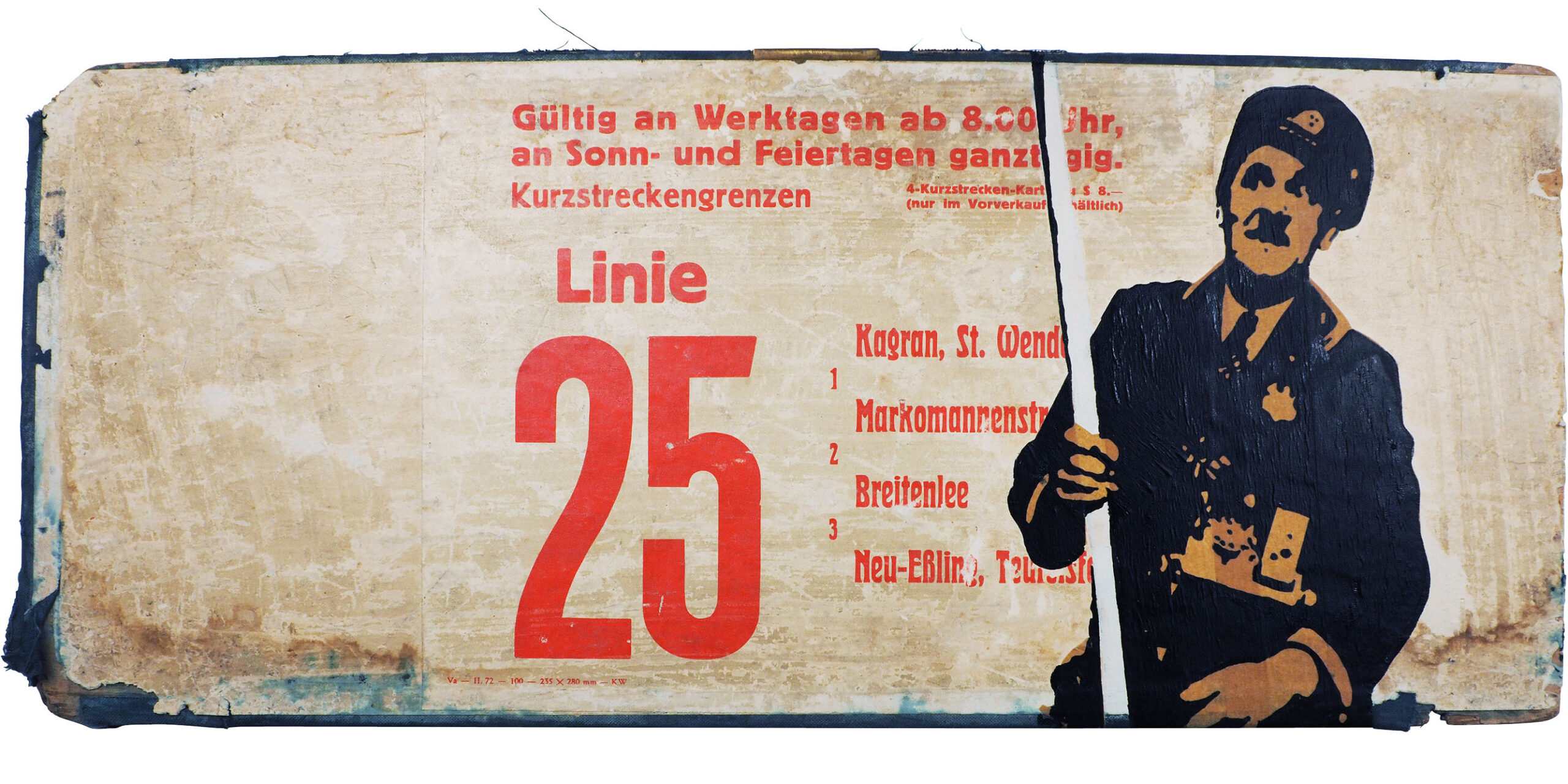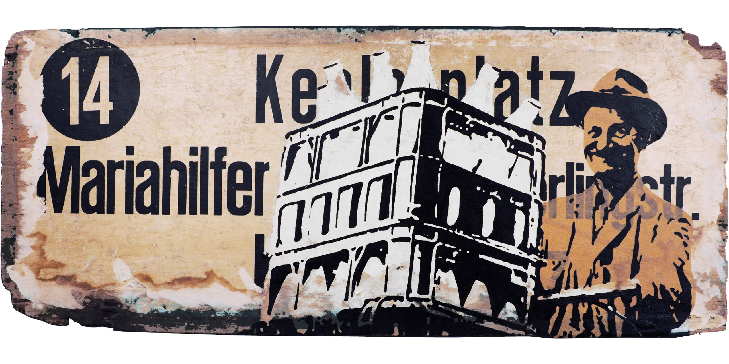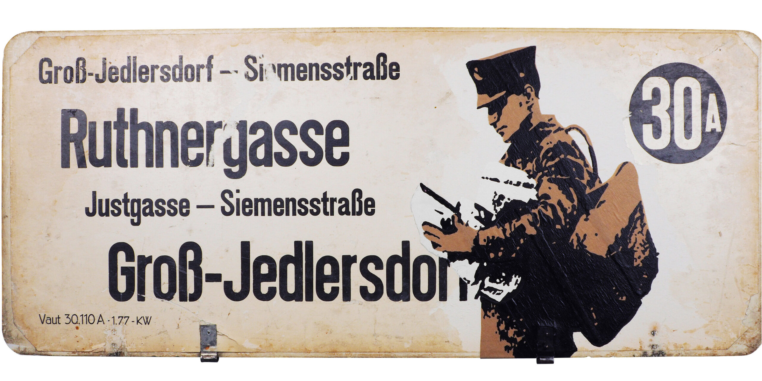 Im April 2025 entdeckte ich auf einem Wiener Trödelmarkt einen Stand voller alter Zug-, Bus- und Straßenbahn-Schilder. Die Wiener sind sehr stolz auf ihre Straßenbahn, die sie liebevoll „Bim“ nennen. Gemeinsam mit dem Händler durchwühlte ich einen hohen Stapel und wählte die zehn Straßenbahn-Schilder aus, die mich am meisten begeisterten. Darauf habe ich mit Acrylfarbe, Packband und Tusche alte Berufe verewigt – ein kleines Stück Wiener Alltag, eingefangen in der charmanten Mischung aus Nostalgie und Stadtleben, die für mich den unverwechselbaren Zauber Wiens ausmacht.